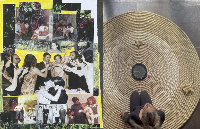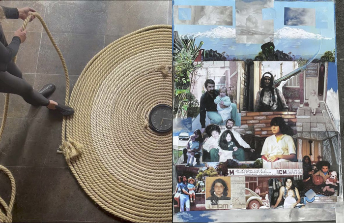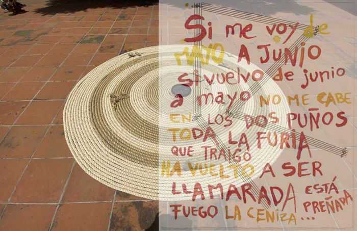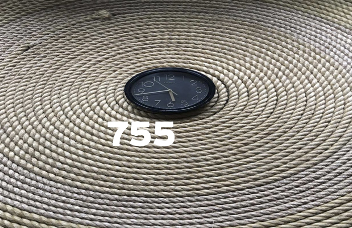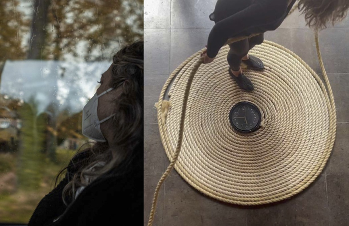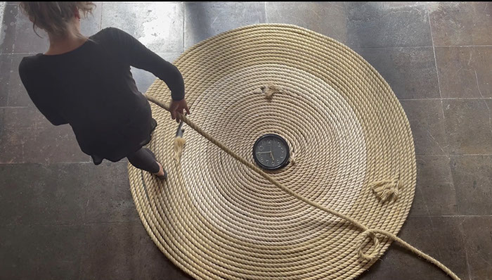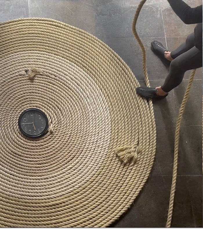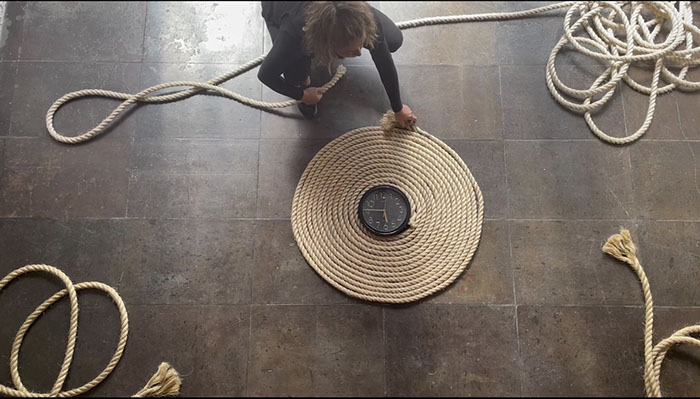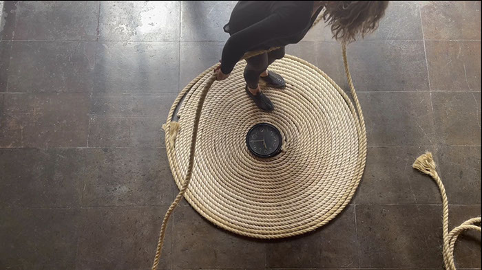 Ésta tiene relación con la pieza Torbellino que realicé en 1993 y que retomé en 2019 como parte de un contexto expositivo en el que se presentó. No quise repetirla, pero tener el material a la mano dio lugar al trazo de una espiral de cuerda alrededor de un reloj; a esta escultura incorporé la idea de Partitura Emocional. Entonces silbo todas las canciones que figuran en las otras Partituras simultáneamente a la acción de colocar la cuerda alrededor del reloj.