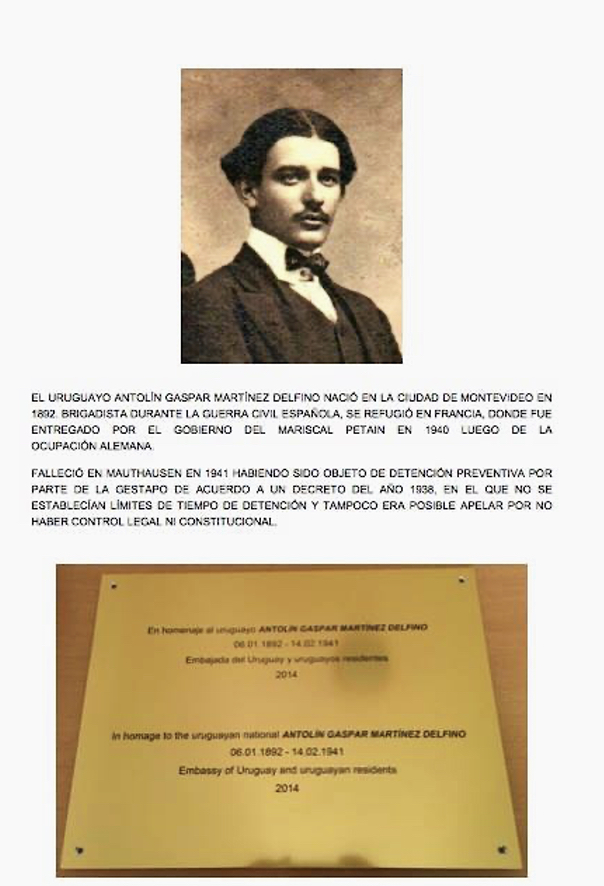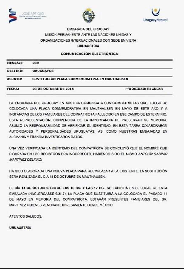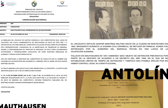El 8 de mayo de ese año y como parte del desfile en el que se presentan respetos y honores a los fallecidos del campo Mauthausen, la embajada había colocado una placa en el Memorial con el nombre que había arrojado una primera investigación.