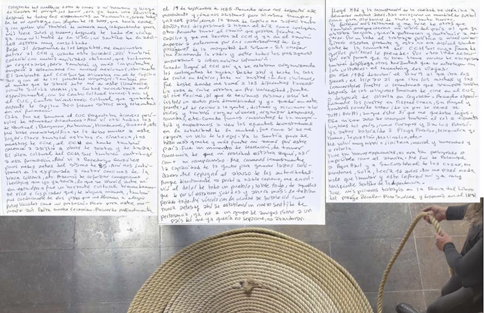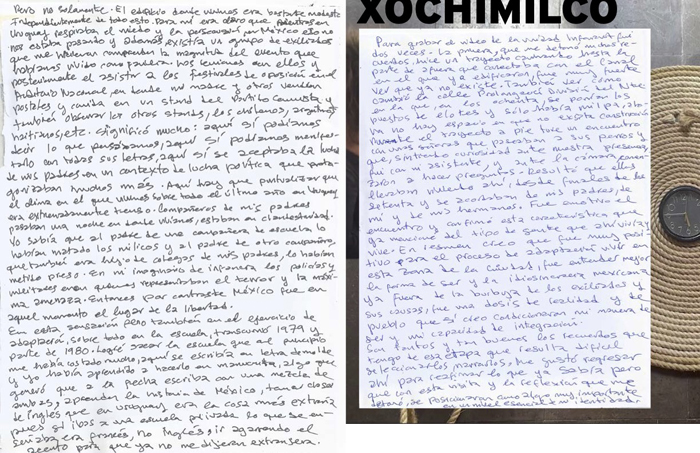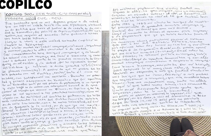 Protagonicé un exilio político que me trajo a México en 1978, a la edad de ocho años; no había abordado este tema en mis propuestas artísticas pues generalmente éstas no se habían articulado en coordenadas autobiográficas, al menos no explícitamente. Quise profundizar en este aspecto de la mano de los testimonios de mis padres quienes, a través de compartir su experiencia, como una microhistoria, proyectan también la de su generación; tomé conciencia de que ya son mayores y que ésta era la oportunidad de rescatar su relato que también es el de mucha gente.