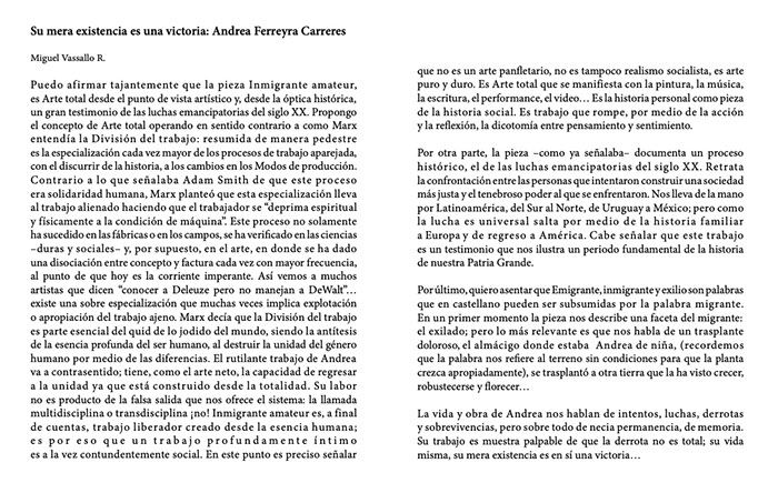 Proyecto que contó con el apoyo de Sistema Nacional de Creadores (2019-2022) y que se propone como una reflexión sobre la inmigración partiendo de la experiencia propia de exilio político, así como la historia de mi tío bisabuelo, uruguayo que se fue a España como brigadista internacional a luchar por la causa republicana.