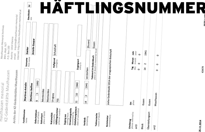 Así fue como viajamos a Viena en octubre de 2014, nos hospedamos en la residencia del embajador, asistimos a la sustitución de la placa y mi madre emprendió la investigación con el International Tracing Service que posteriormente develó la ruta de Antolín quien fue brigadista en la guerra civil española, cruzó a Francia por Barcelona en 1939, lo detuvieron en Gurs, lo liberaron, de ahí fue a Pas de Calais en donde entró a trabajar en una mina y en octubre de 1940 fue detenido por la Gestapo, llevado, primero a Alemania, luego a Mauthausen y ya, cuando estaba muy mal, trasladado a Gusen en donde murió en febrero de 1941.